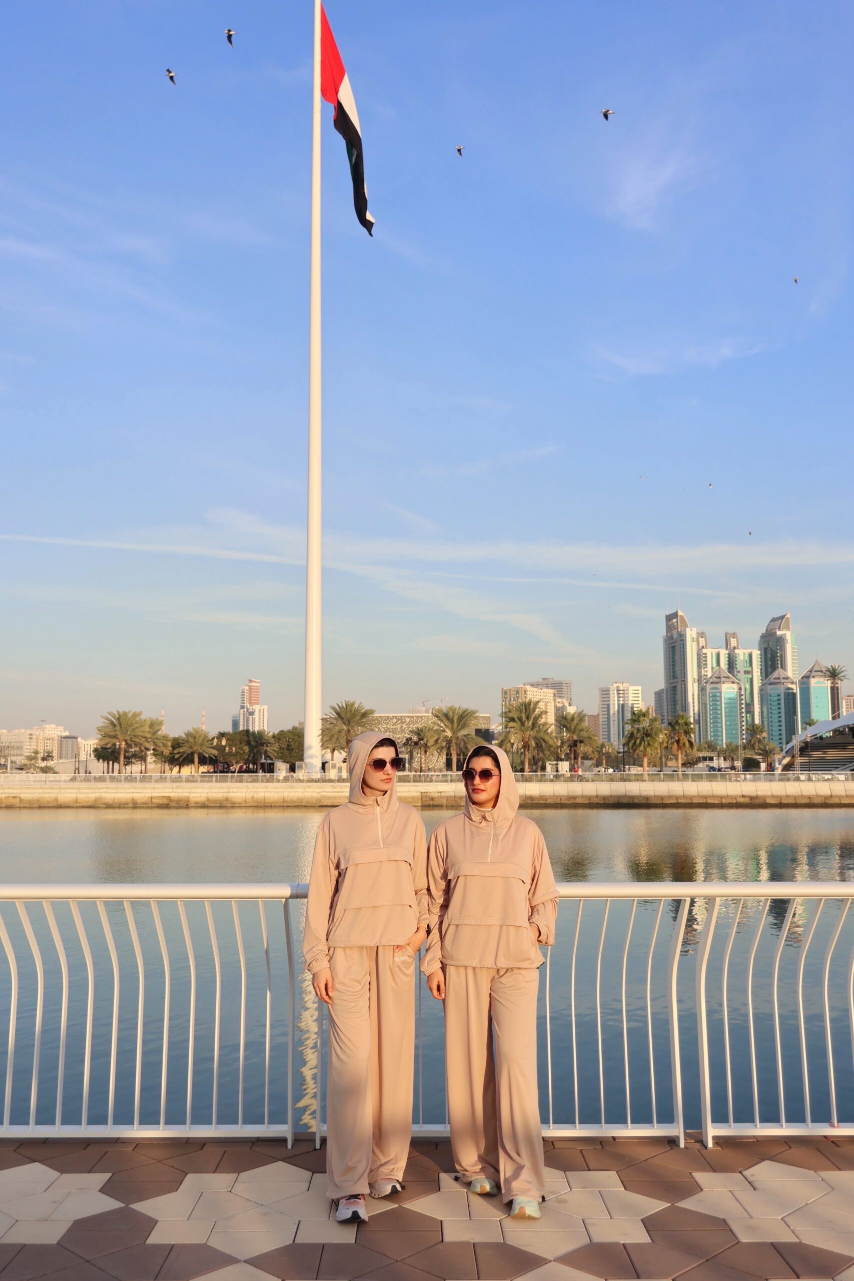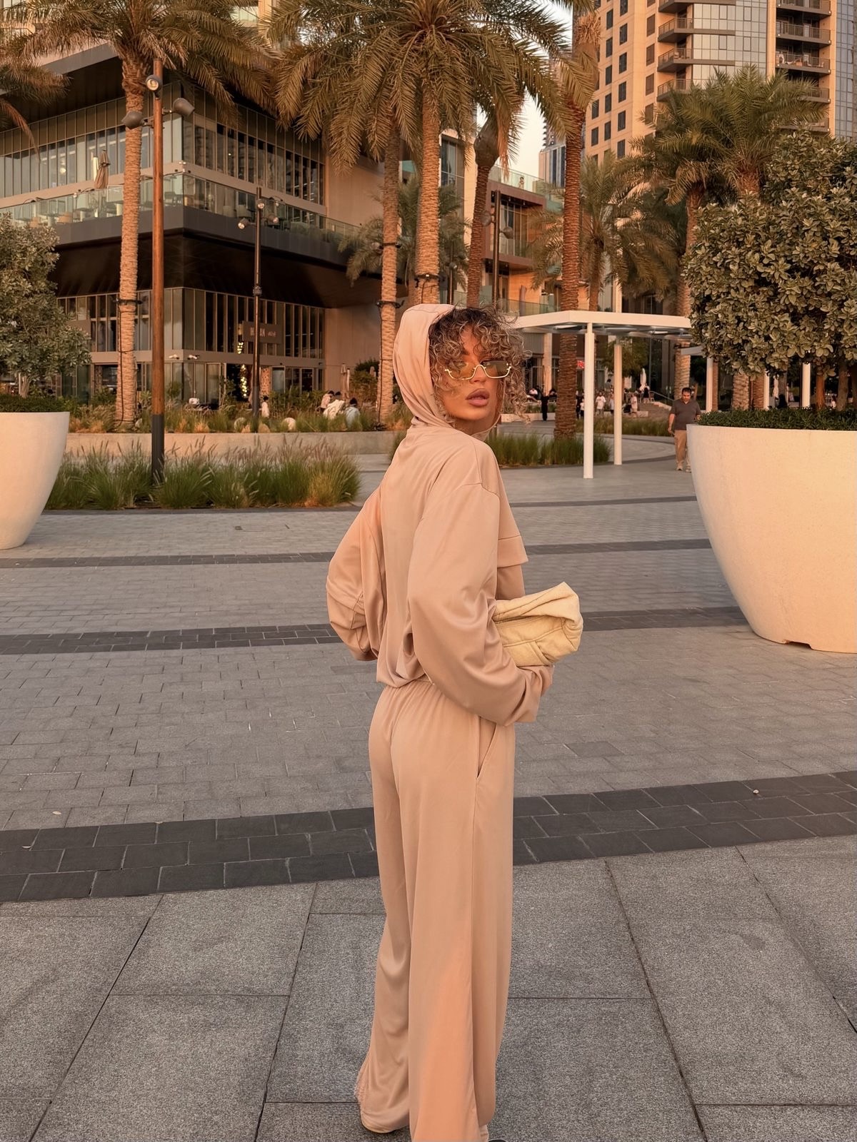 Crafted from an ultra-breathable, sweat-resistant fabric, this set feels weightless on the body and drapes away for airflow in warm climates. Finished in a soft champagne tone that subtly glistens in the light, it delivers an elevated, effortless look while maintaining comfort and ease of movement. Easy to layer, easy to style, and made to stay comfortable all day.